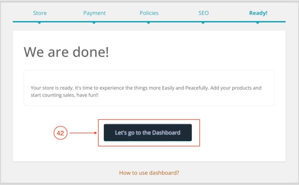 1. Alas! Hooray! You are done setting up your store/shop. Click Let’s go to the dashboard to access your store/shop menu.