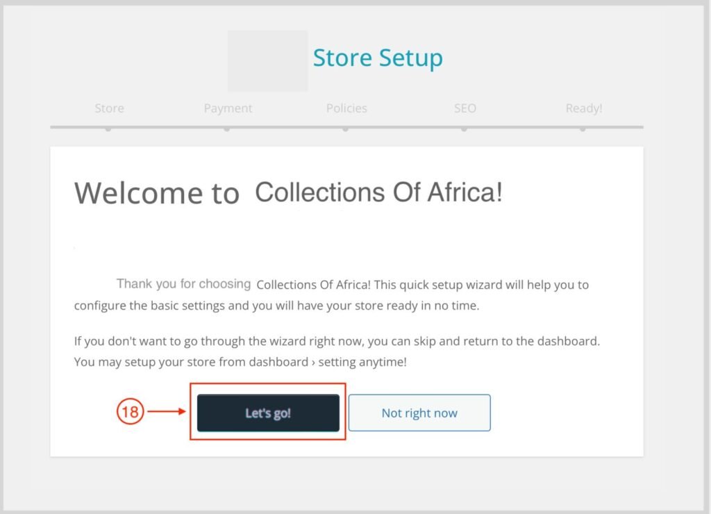 1. Click Let’s go to proceed with the store setup. You can also click Not right now to skip this section. You can continue your store set up by clicking settings in the dashboard menu.